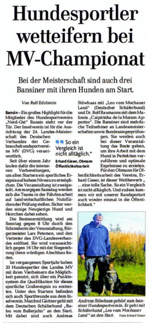 Ein besonderes Dankeschön geht an den Spfrd. Arthur Hackbusch (HSV Ludwigslust), der sich kurzfristig bereit erklärte, die Stadionsprecherrolle zu übernehmen, der Gemeinde Ostseebad Heringsdorf, dem Eigenbetrieb "Drei-Kaiserbäder Insel Usedom", dem Vorstand und den Mitgliedern des FC "Insel Usedom", Herrn Jürgen Rehfeld und seiner Crew aus Relzow mit ihrer "Partyfeuerwehr" und allen die es uns ermöglichten, dieses Event zu einem Höhepunkt im Hundesport des Landes Mecklenburg-Vorpommern werden zu lassen.