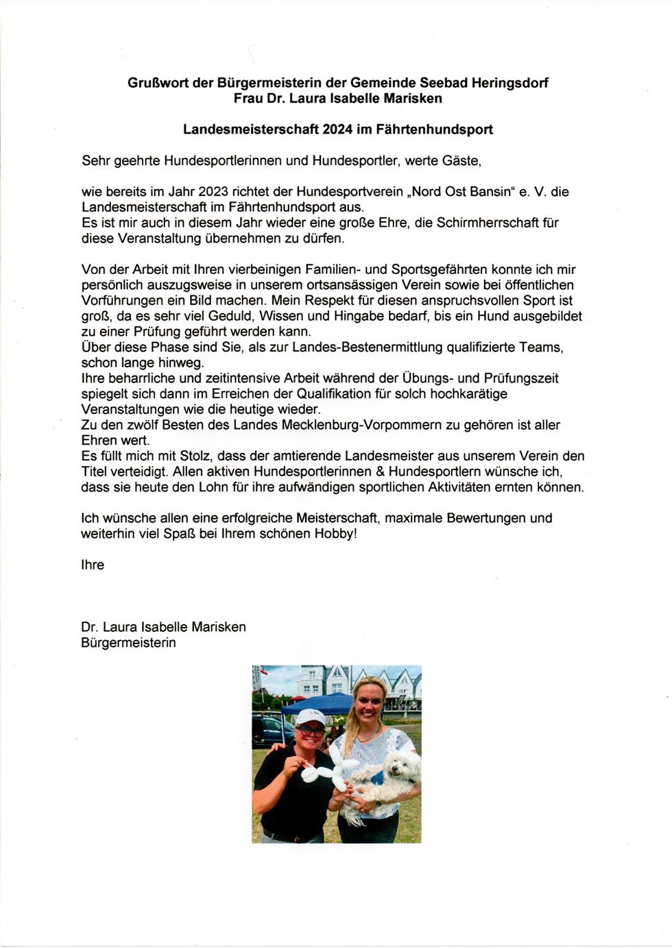 Zur Siegerehrung konnten wir als Repräsentanten der Gemeinde Ostseebad Heringsdorf den Amtsleiter Herrn Andreas Hartwig begrüßen, der im Namen der Bürgermeisterin als Schirmherrin einen Ehrenpreis an die Siegerin der Bestenermittlung überreichte. Souverän durch die Veranstaltung führte Sportfreund Peter Schütz als Prüfungsleiter mit seinem Mitstreiter Torsten Schmidt vom Güstrower Hundesportverein.